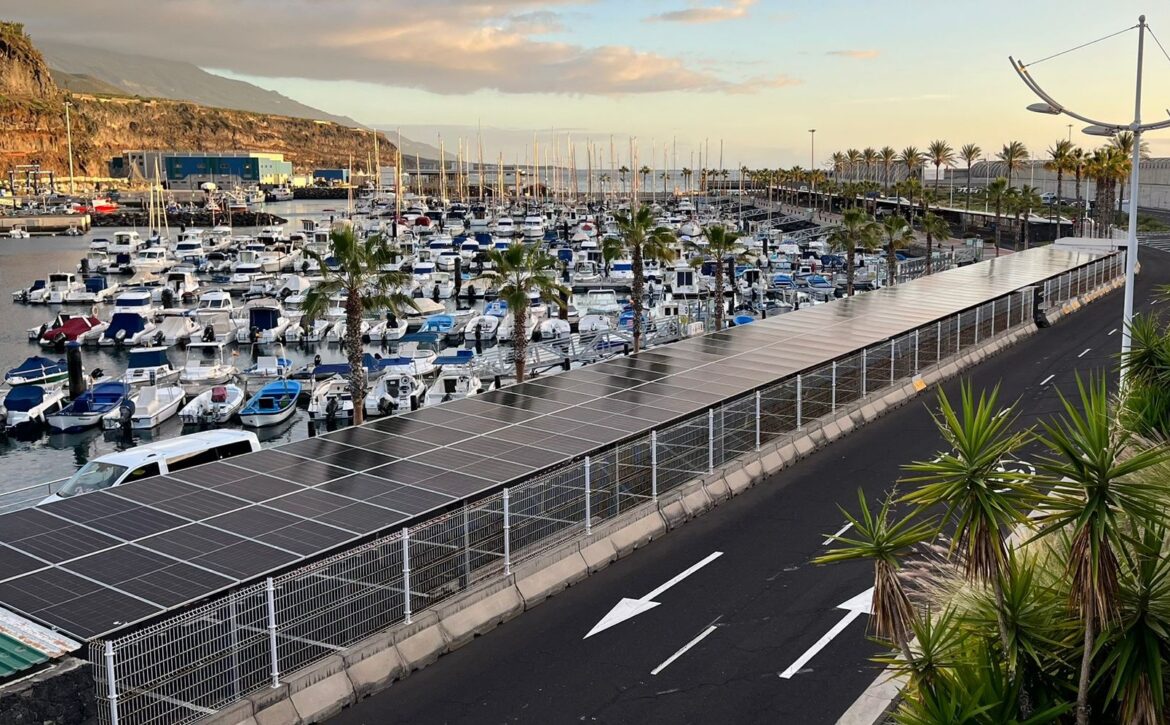 IASOL ha finalizado la construcción y puesta en marcha de una instalación fotovoltaica de autoconsumo de 116,84 kWp (100 kWn) con almacenamiento energético de 80 kWh en el Puerto de Tazacorte, ubicado en la isla de La Palma (Canarias). El sistema, desarrollado bajo la modalidad sin excedentes, se integra en una marquesina fotovoltaica, contribuyendo a mejorar la eficiencia energética de las infraestructuras portuarias y a reforzar su compromiso con la sostenibilidad.
